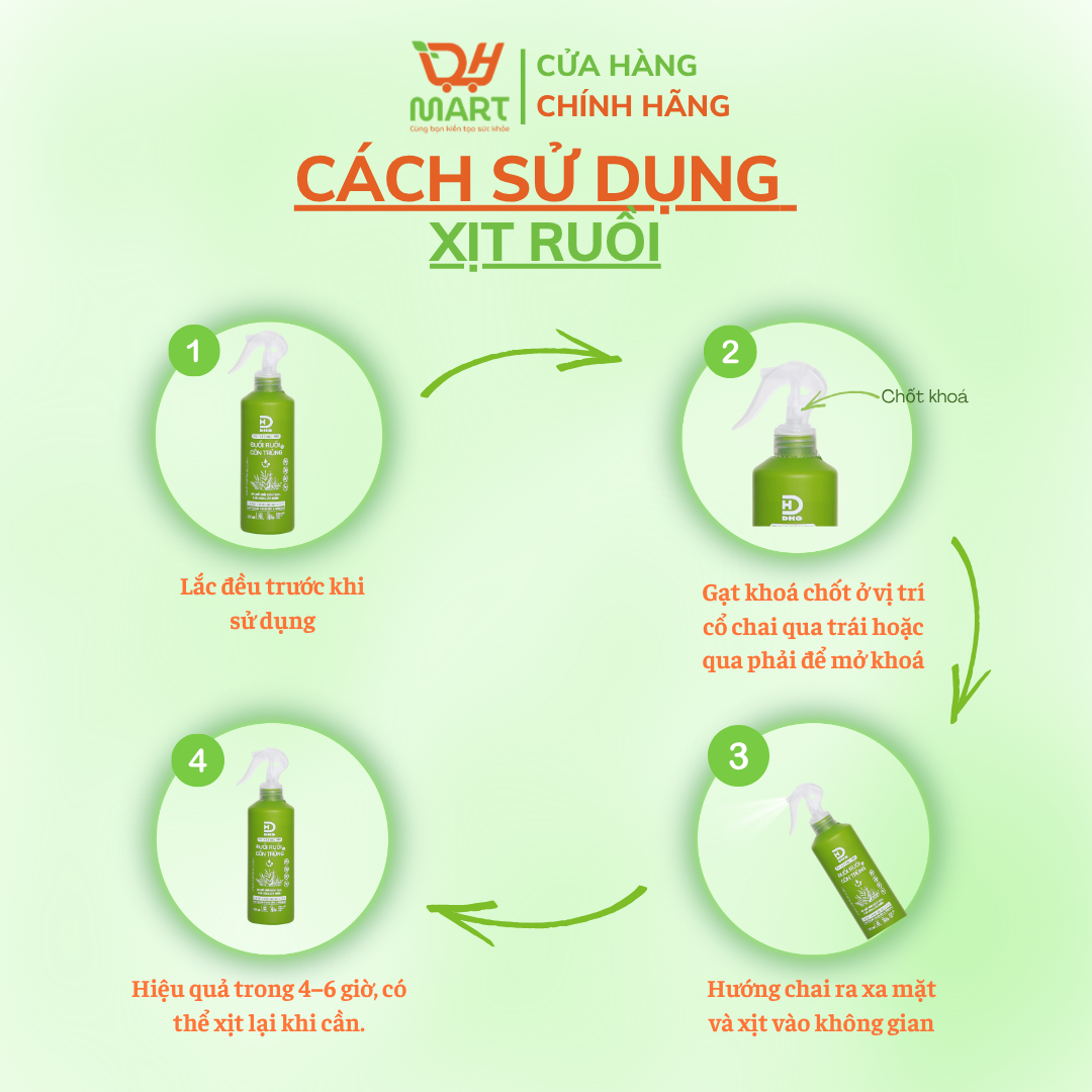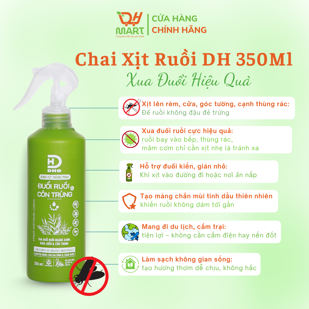 - Chai Xịt Ruồi DH 350Ml là giải pháp an toàn và hiệu quả để xua đuổi ruồi và côn trùng. Với hương chanh sả dễ chịu, sản phẩm giúp bảo vệ sức khỏe và mang lại không gian sống trong lành.